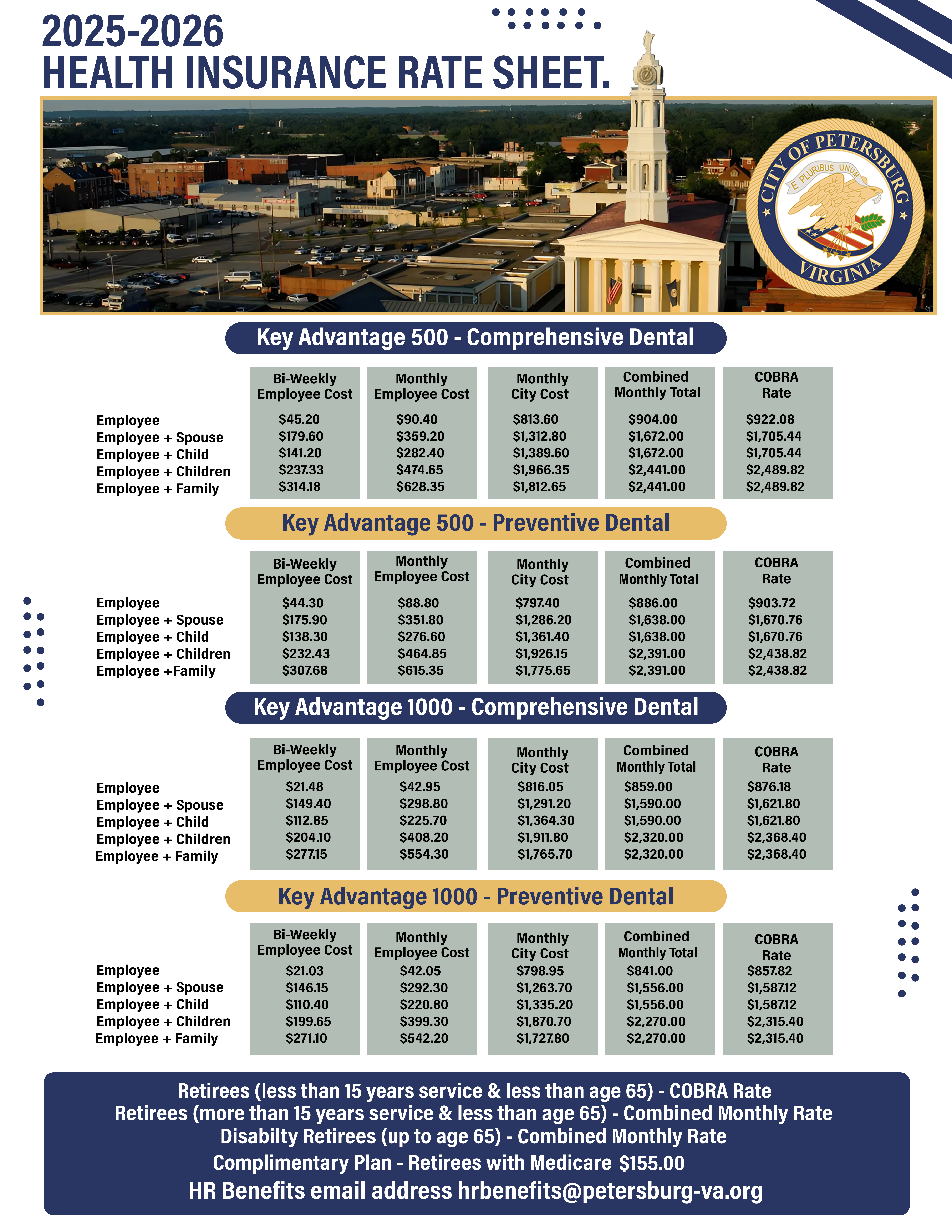 The City of Petersburg offers the comprehensive and preventative Key Advantage 500 and Key Advantage 1000 plans.